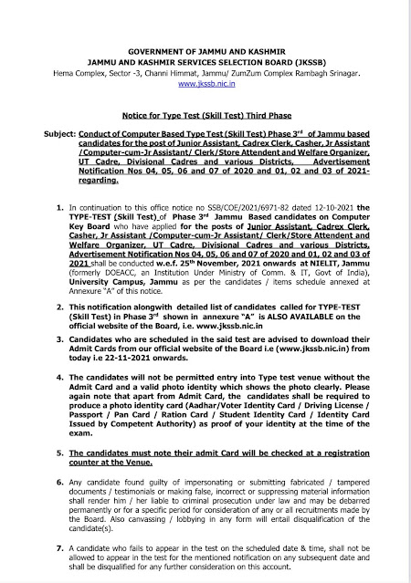 Conduct of Computer Based Type Test (Skill Test) Phase 3rd of Jammu based candidates for the post of Junior Assistant, Cadrex Clerk, Casher, Jr Assistant /Computer-cum-Jr Assistant/ Clerk/Store Attendent and Welfare Organizer, UT Cadre, Divisional Cadres and various Districts, regarding.
